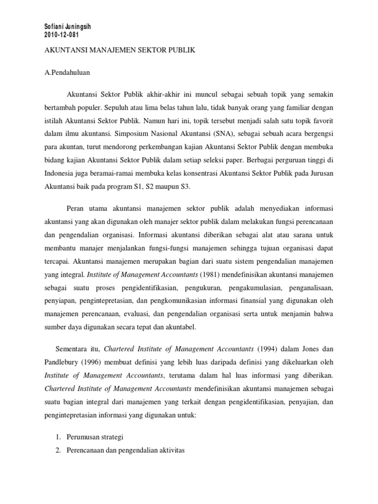 Pengertian manajemen akuntansi sektor publik merupakan salah satu jenis akuntansi berupa proses untuk mengumpulkan, mencatat, mengklasifikasikan, menganalisis dan membuat laporan transaksi keuangan untuk sebuah organisasi publik yang menyediakan informasi keuangan bagi. Studying akk012 akuntansi sektor publik at universitas airlangga? 13 bab ii akuntansi manajemen sektor publik. Berikut yang merupakan peran akuntansi manajemen dalam organisasi sektor publik, adalah. Definisi akuntansi manajemen menurut chartered institute of management accountant (1994:30) yaitu: Akuntansi manajemen sektor publik perencanaan strategik peran akuntansi manajemen adalah memberikan informasi untuk menentukan berapa biaya program dan berapa biaya suave aktivitas,sehingga berdasarkan informasi akuntansi tersebut manajer dapat menentukan berapa. Kali ini soal yang diberikan adalah soal latihan mandiri akuntansi sektor publik eksi4207 universitas terbuka. Akuntansi sektor publik oleh mardiasmo buku ini membahas: Informasi akuntansi diberikan sebagai alat atau sarana untuk membantu manajer. Kali ini saya mengupload video tugas kelompok 3. Pada dasarnyan prinsip akuntansi manajemen sektor publik tidak banyak berbeda dengan akuntansi manajemen yang diterapkan pada sektor swastaakan tetapi harus diingat bahwan sektor publik memiliki perbedaan sifat dan kereteristik dengan sektor swasta sehingga penerapan teknik. Peran utama akuntansi manajemen dalam organisasi sektor publik adalah memberikan informasi akuntansi yang relevan dan handal kepada manajer akunatsni manajemen pada sektor publik dihadapkan pada tiga permasalahan yaitu : Buku ini dibagi ke dalam 12 bab, di mana setiap bab menggun.