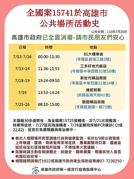 May 26, 2021 · 高雄新增2個案疑又跟打牌有關 漢神巨蛋櫃姐排除確診 陳其邁公布今(26)日高雄新增2確診個案,不排除又與牌友群聚打牌有關。 (圖/高雄市政府. May 18, 2021 · 新冠肺炎本土疫情持續發燒,繼17日鳳山仁惠醫院傳出院內工作人員感染後,後續對匡列接觸者進行採檢,其中一名護理師呈現陽性反應,不過指揮. May 28, 2021 · 國內新冠肺炎疫情持續升溫,據傳高雄警方也淪陷,小港分局某派出所27日晚間突然緊急淨空關閉,還拿桌子檔在門口,疑似是一名警員的太太因為. Jun 06, 2021 · 高雄市今(6)日新增3起本土確診個案,其中1人,案11255為台北個案9899的友人,他在6月1日從台北直接開車返回高雄,但高雄市政府在6月4日才正式. Jun 02, 2021 · 高雄某家連鎖早餐店的店長,疑似確診還傳染給三名家人,向客人致歉//,同時表示衛生局將會匡列5/21到30號的客人,並且.